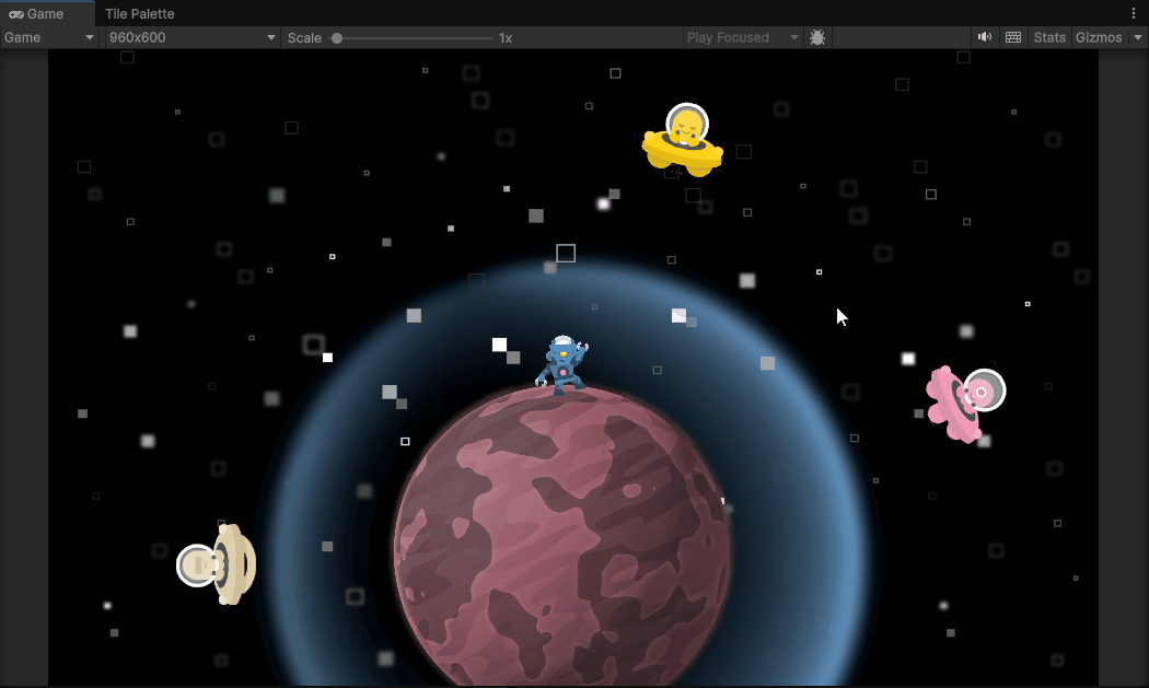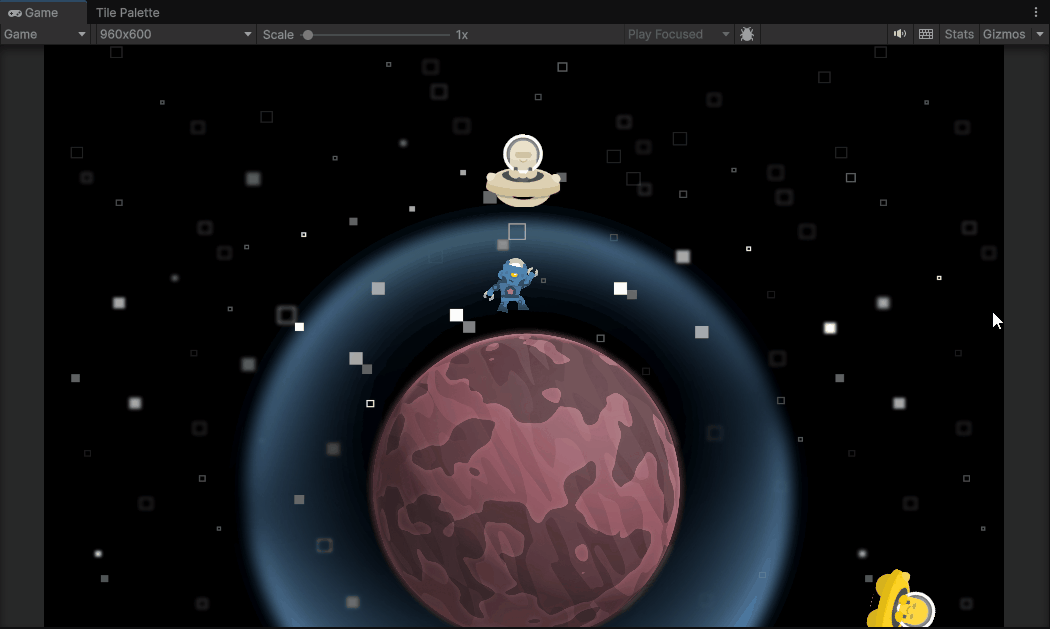Lastly, we need a script to move the player itself. I wanted side to side and a jump. The jump is pretty simple, mostly. Just add force in the opposite direction of the planet from the player only when the player is touching the planet (so we don't jump into infinity). I used a small raycast to detect if the player is grounded instead of actual contact, since that felt a bit better to jump around with, as it gave a little leeway for the player to be considered grounded. Moving the player side to side was a little trickier. I needed to find the tangent of the player to the planet and then apply movement based on the direction axis the player was choosing. The maths got a lot more complicated than I wanted it to be, but it was worth it, and I'm really glad it feels good since I think getting this part to work well was going to be one of the most challenging parts of this project. See Figure 2 for the final product (or play it yourself :D).