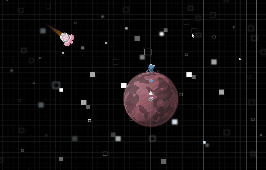 But our pink aliens are not some dumb fire missiles charging headlong into the planet. They should know how to stop and shoot from a distance, and let’s make them orbit the planet, too, because that’ll look cool and might add some interesting quirks to the gameplay. See Figure 2 for what that looked like initially.